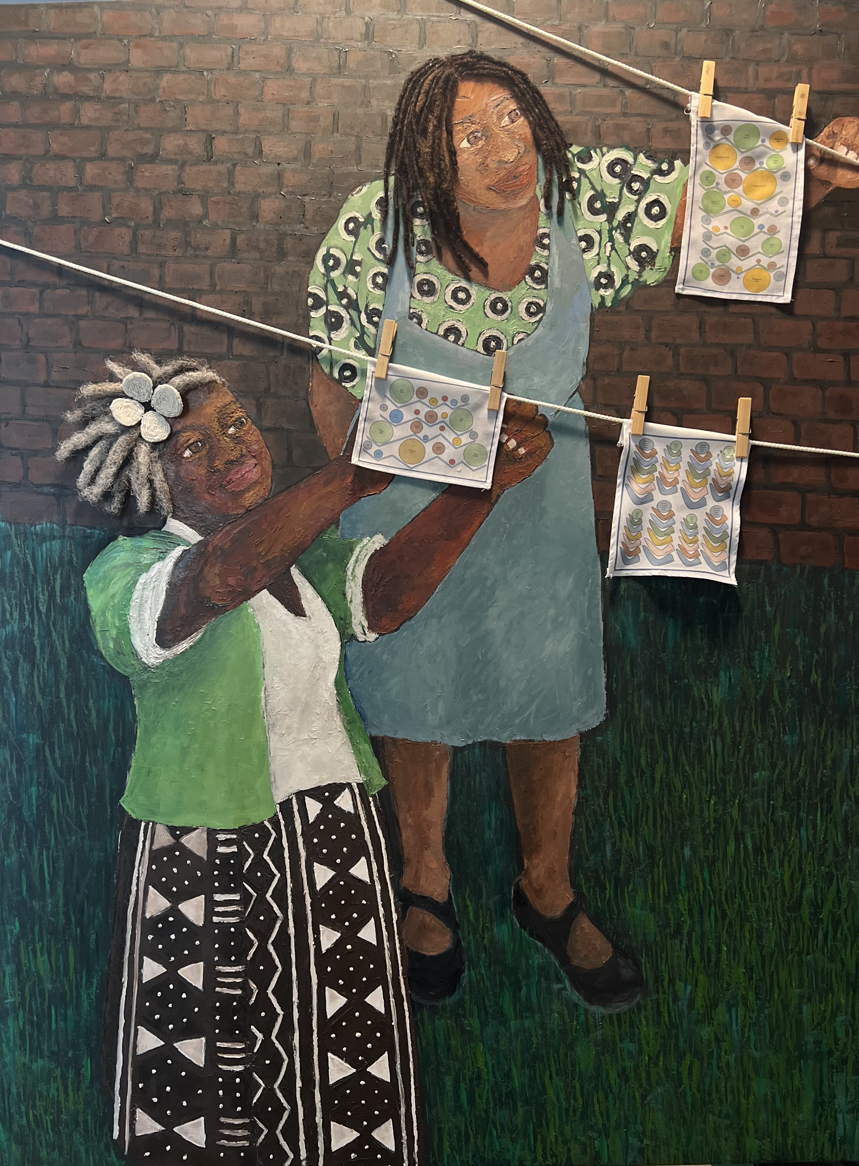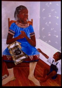 Mixed Media (Oil on board, beads, cowrie, cotton fabric, hair)
