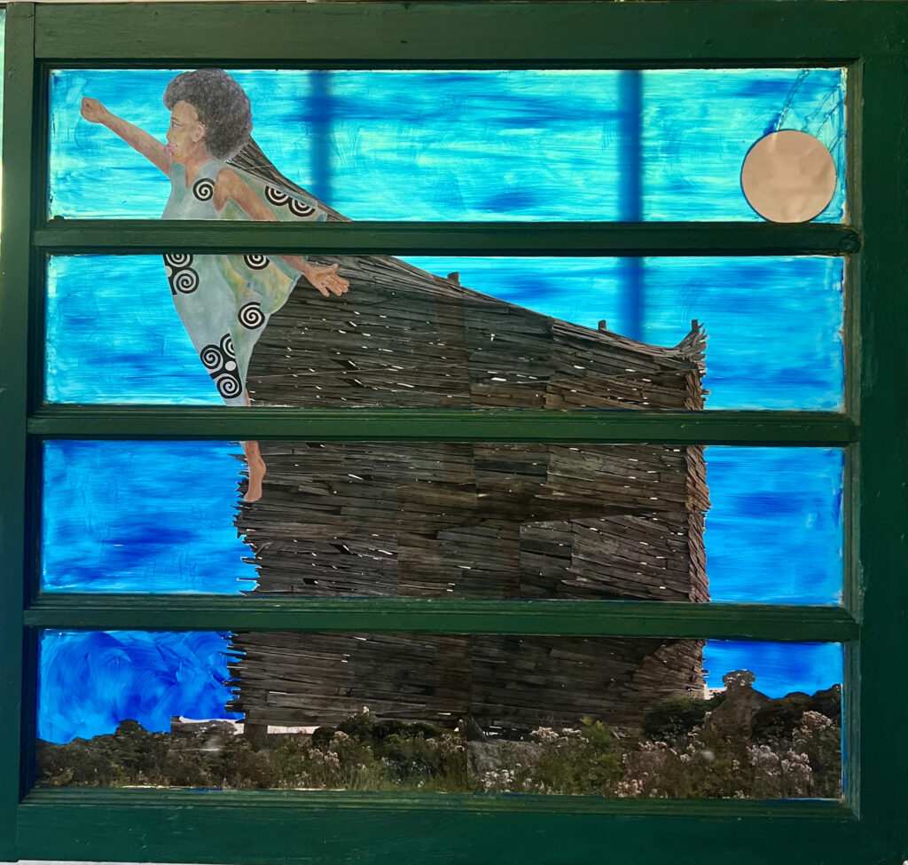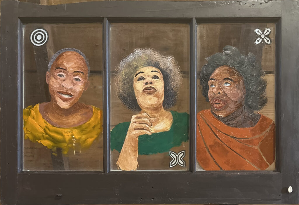 Mixed Media (oil on wooden window, glass, cowrie, paper)